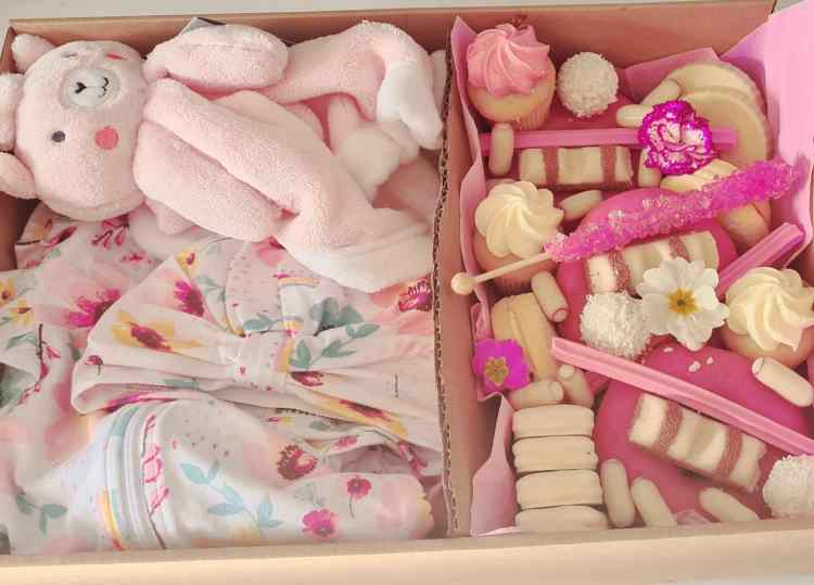 Savoury Mix or sweet Mix with a Bonds romper suit and soft toy/rattle.