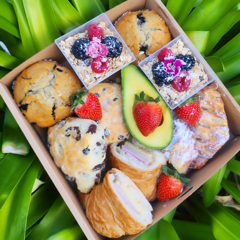 Ham and cheese crossiants, muesli and yoghurt cups, waffles, muffins, scones, avocado and seasonal fruit.